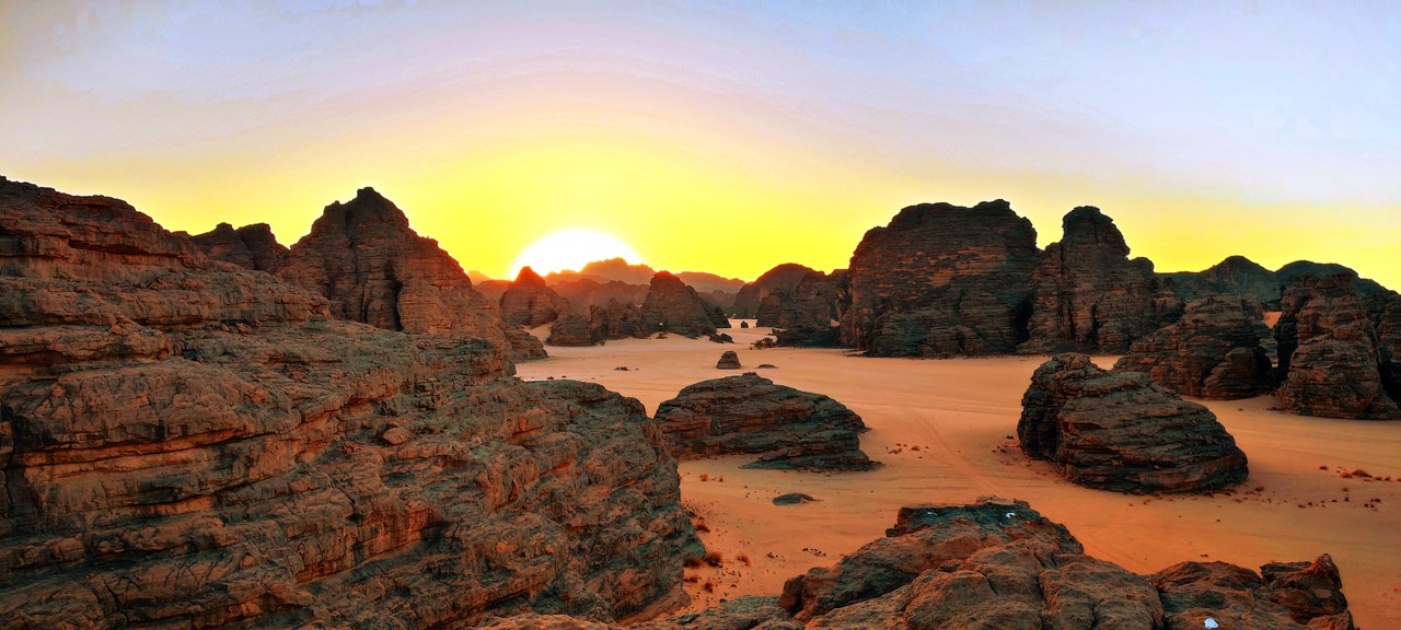 The largest African country is bordered in the east by Tunisia and Libya, in the west by Morocco, Western Sahara and Mauritania, in the southwest by Mali, in the southeast by Niger, and in the north by the Mediterranean Sea with the main towns, fertile land and beach resorts.