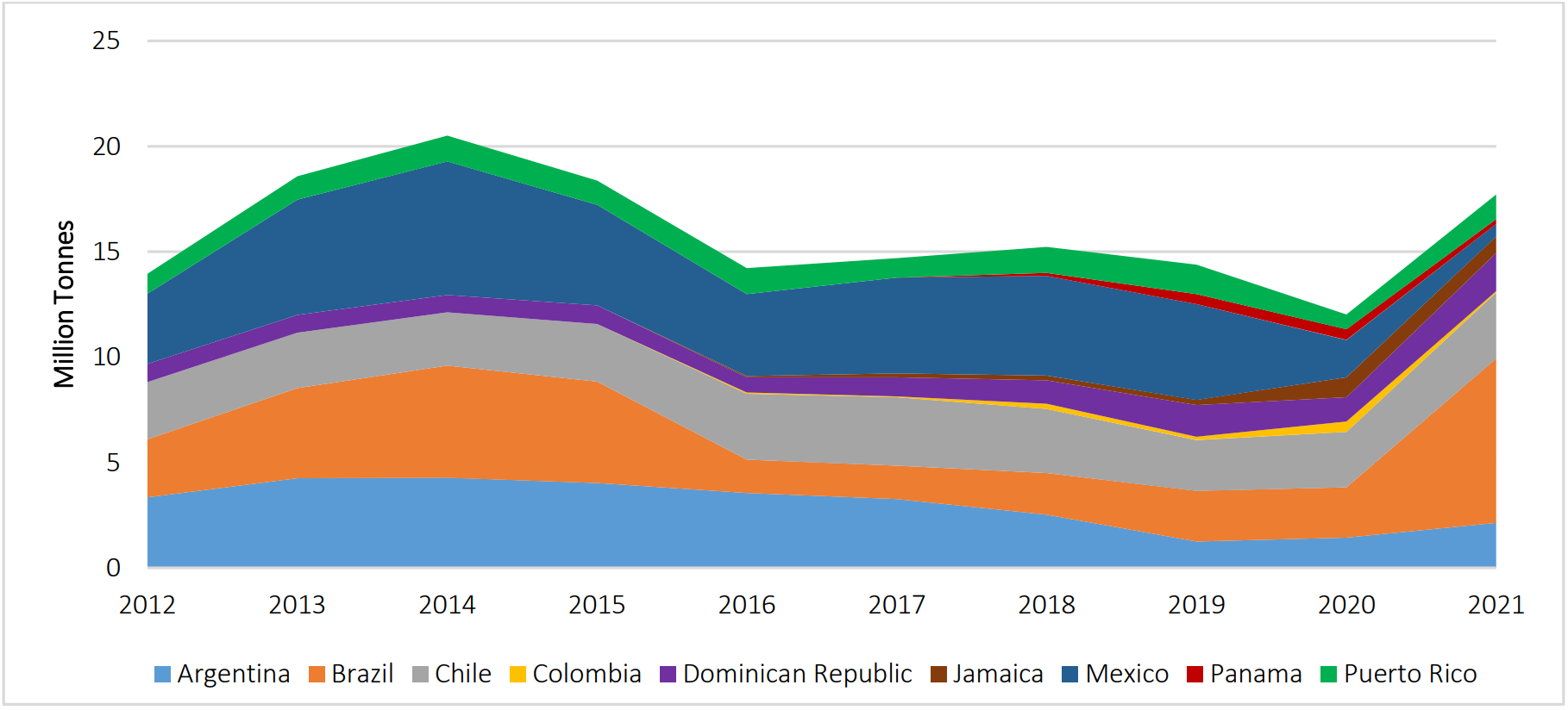 Regional LNG imports into Latin America (LatAm) and the Caribbean peaked at almost 21 million tonnes (Mt) in 2014 after which it plunged to around 14-15 Mt per annum between 2016 and 2019 (Figure 1). In 2020, LNG imports declined further to a low of 12 Mt but rebounded sharply to almost 18 Mt in 2021. The weaker LNG imports in the region between 2015 and 2019 were attributed to several factors, particularly in Argentina, Brazil and Mexico. In 2020, the further decrease in LNG imports came mainly from Mexico. Further ahead, Brazil drove the surge in the region’s LNG imports in 2021. Despite the decline in LNG imports in the region since 2015, a few countries in the region have joined the club of LNG importers including Barbados, Colombia, Jamaica and Panama. Barbados started LNG imports in ISO containers in 2016.