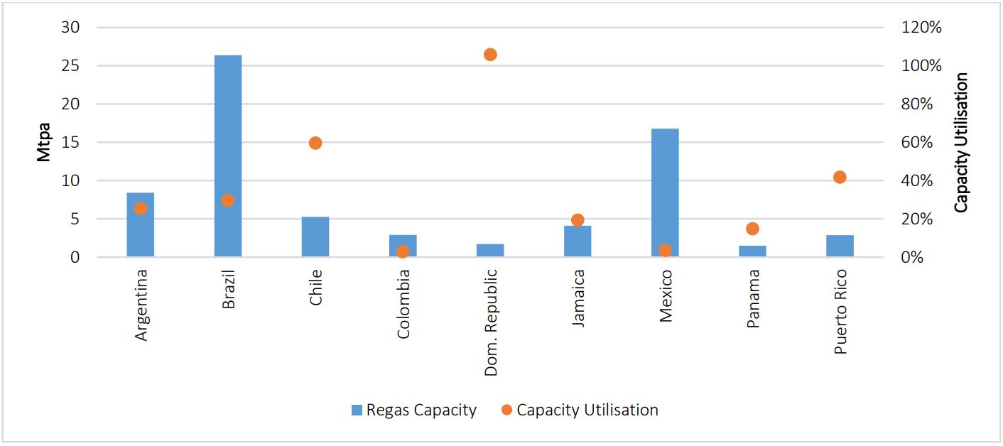 Figure 3: LNG regasification capacity and capacity utilisation in 2020 by country in LatAm and the Caribbean