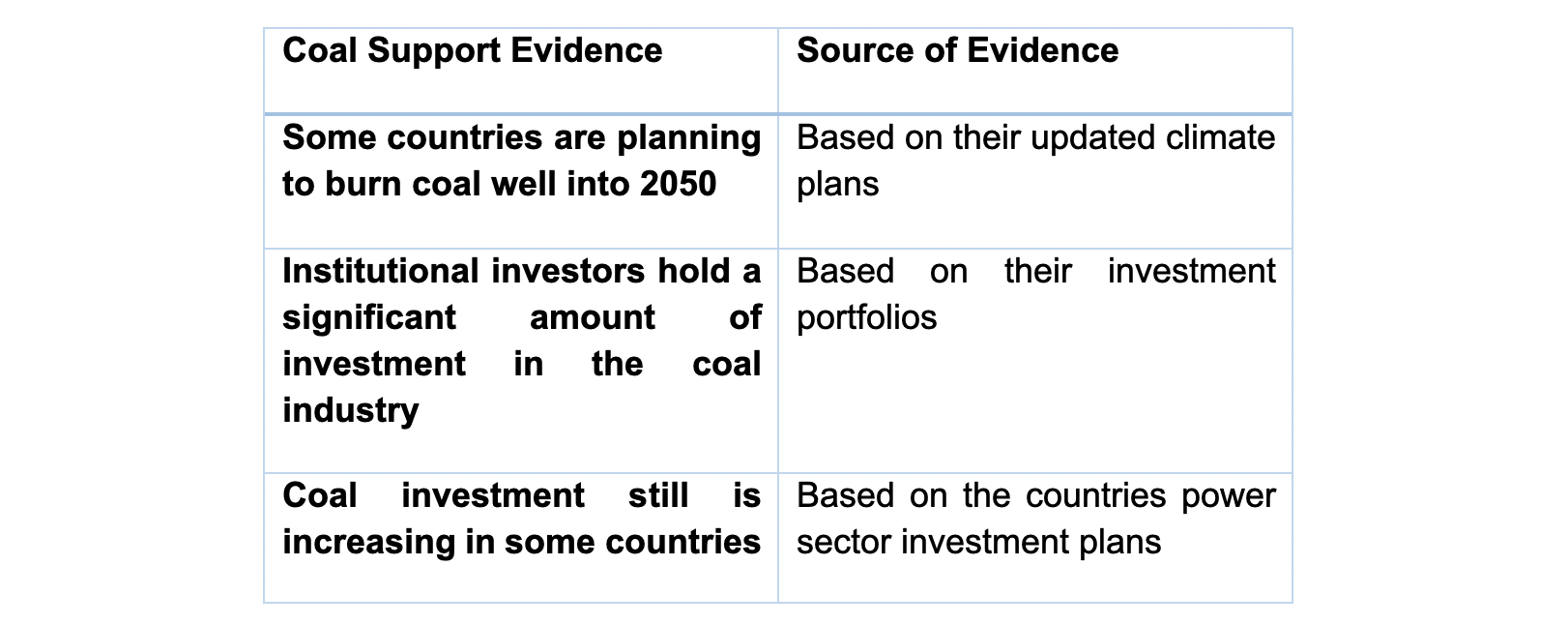 Table: Coal support evidence across the globe