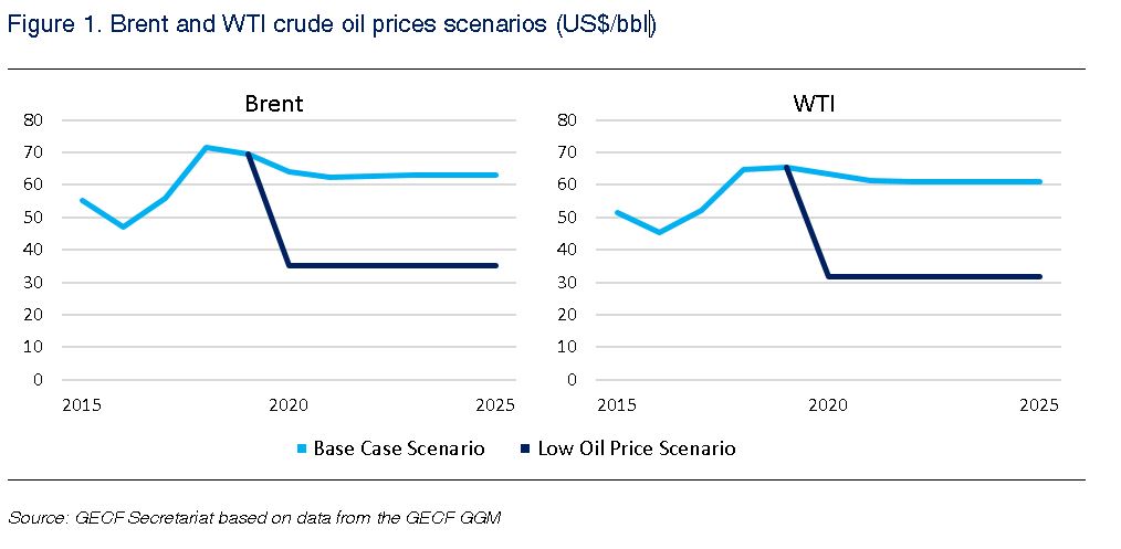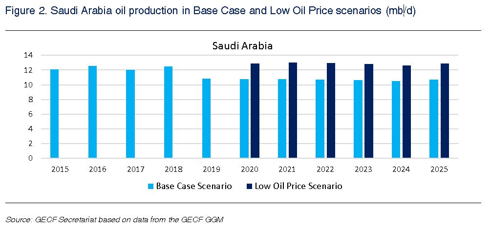 Therefore, in the Low Oil Price scenario we forecast Saudi Arabia’s crude oil production to increase and to oscillate at around 13 mb/d between 2020 and 2025. In the Base Case scenario, the OPEC/non-OPEC oil production cuts would level off, Brent oil prices hover at $63 per barrel, and Saudi’s crude oil supplies remain at around 10.5 mb/d.