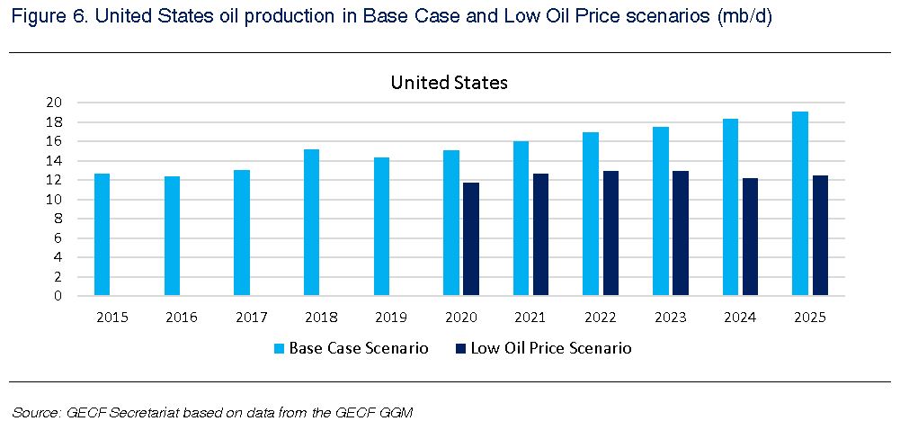 Saudi Arabia and Russia can tolerate lower oil prices, allowing them to increase their production. However, for the US we forecast that the country’s oil outputs will decline in a Low Oil Price scenario and consequently the US will lose its position to Saudi Arabia as the world’s largest oil producer in the world.