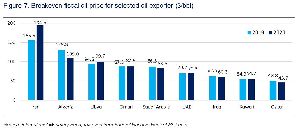 Algeria’s 2020 budget is based on $60 oil price and with current oil price, the government probably will slash its budget for 2020 in order to be able to fund its expenditure. According to the IMF, Saudi Arabia needs slightly less than $84 and for the UAE will be $70 per barrel this year. Qatar has the lowest breakeven fiscal oil price of about $46 per barrel in 2020.