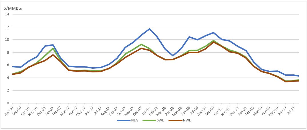 A recent retrospective analysis shows that in August 2019, LNG spot prices in the Northeast Asian (NEA) market fell by more than 60% to $4.3/MMBtu from an average $10.6/MMBtu in August 2018. Likewise, spot LNG prices in most European hubs stood below $4/MMBtu in August 2019 from almost $8.9/MMBtu in the same month last year (Figure below). These ongoing trends of declining prices, which started in October 2018, are a result of the much-anticipated oversupply in the global LNG markets. In fact, despite the bullish trends of LNG markets in the first nine months of 2018, market fundamentals have totally changed since the last quarter of 2018. While LNG demand has slowed down, especially in the Asian market, increasing LNG from Australia (13.4 Mtpa), the U.S. (14.3 Mtpa), Russia (11 Mtpa) and Cameroon (2.4 Mtpa) resulted in a big supply in the last quarter of the year 2018. The majority of this 41 Mtpa of additional capacity ramped up in the last quarter of the year. However, taking into account the overall developments of the year 2018, the global LNG market experienced an almost 10% growth in terms of traded volumes. Meanwhile, LNG prices have increased across all regional markets. The spot LNG price averaged $9.8/MMBtu in NEA, almost 33% higher than a year before. LNG prices in Southwest Europe (SWE) and Northwest Europe (NWE) averaged $8.17/MMBtu and $8/MMBtu, representing 25% and 33% growth respectively when compared with average prices in 2017. Therefore, the year 2018 did not experience the so-called glut in the LNG market, as expected by many experts.