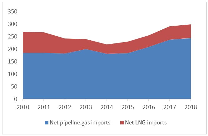 The European gas import needs are met by pipeline gas and LNG, with pipeline gas dominating in the supply (Figure 1). In 2010-2015, net pipeline gas imports fluctuated in the range of 180 Bcm and 200 Bcm, and afterwards they grew robustly, reaching 244 Bcm in 2018. Meanwhile, net LNG imports fell from 84 Bcm in 2010 to 37 Bcm in 2014 and rebounded to 55 Bcm in 2018.
