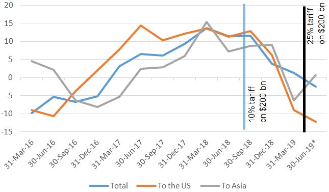 Economic activity in China and the US is already slowing down, albeit the exact role of tariffs already imposed and ongoing trade tensions into that is unclear. Industrial production in China since 2017 stays at decade lows below 6.0% year-on-year, and started to decline further to 5.0% in May. In the US, industrial production is slowing down to below 2.0% as compared to 3.9% in 2018, despite robust GDP growth in Q1.